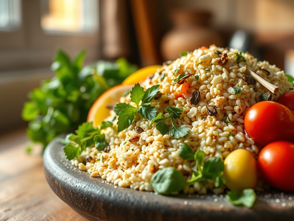 - Quinoa (Branca ou Tricolor): 1 chávena. A quinoa é um pseudocereal que requer uma lavagem vigorosa para remover as saponinas, que conferem um sabor amargo e metálico.